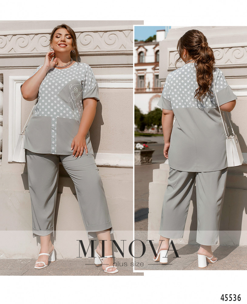 Легкий комфортный костюм с удлиненной блузой и укороченными брюками - идеальный вариант для теплой весны и жаркого лета. Блуза свободного кроя с небольшими разрезами по бокам и короткими рукавами с приспущенной линией плеч выполнена из двух видов тканей: однотонной и в горошек, а также дополнена квадратным карманом с декоративным принтом на груди. Лаконичные брюки-капри на резинке с карманами в боковых швах, асимметричным низом и манжетами только на передней части отличаются удобством и практичностью.