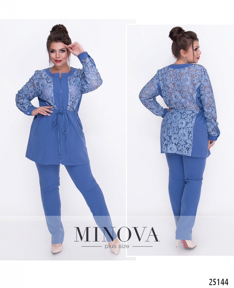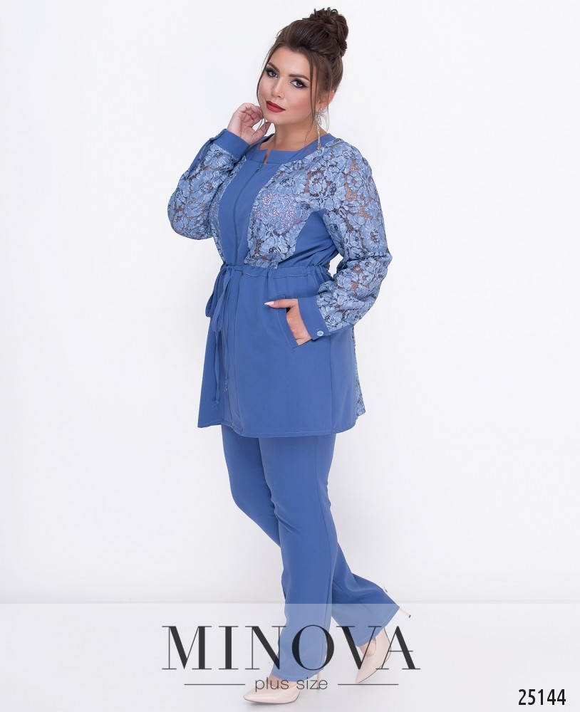 Костюм-двойка из удлиненной курточки на молнии и зауженных брюк на высокой посадке. Куртка со вшитым поясом-шнурком на талии, что легко позволяет регулировать объем. Лиф частично изготовлен из шитья. Подол дополнен карманами. Брюки без карманов застегиваются на молнию и пуговицу. Пояс брюк дополнен шлевками для ремешка и вставками из резинки.