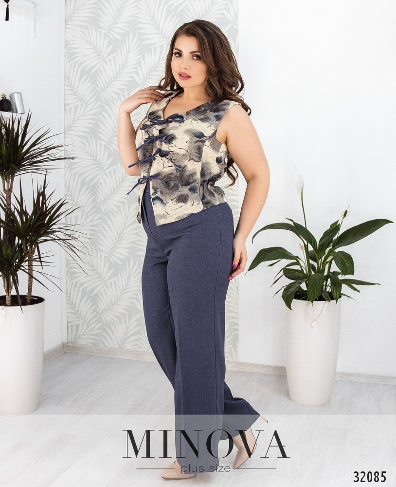 Брючный костюм-двойка с цветной жилеткой. Жилетка завязывает на канатики вдоль планки на лицевой стороне. Прямые брюки со стрелками. Брюки на высокой талии с поясом-планкой, застегивают на пуговицу и молнию.