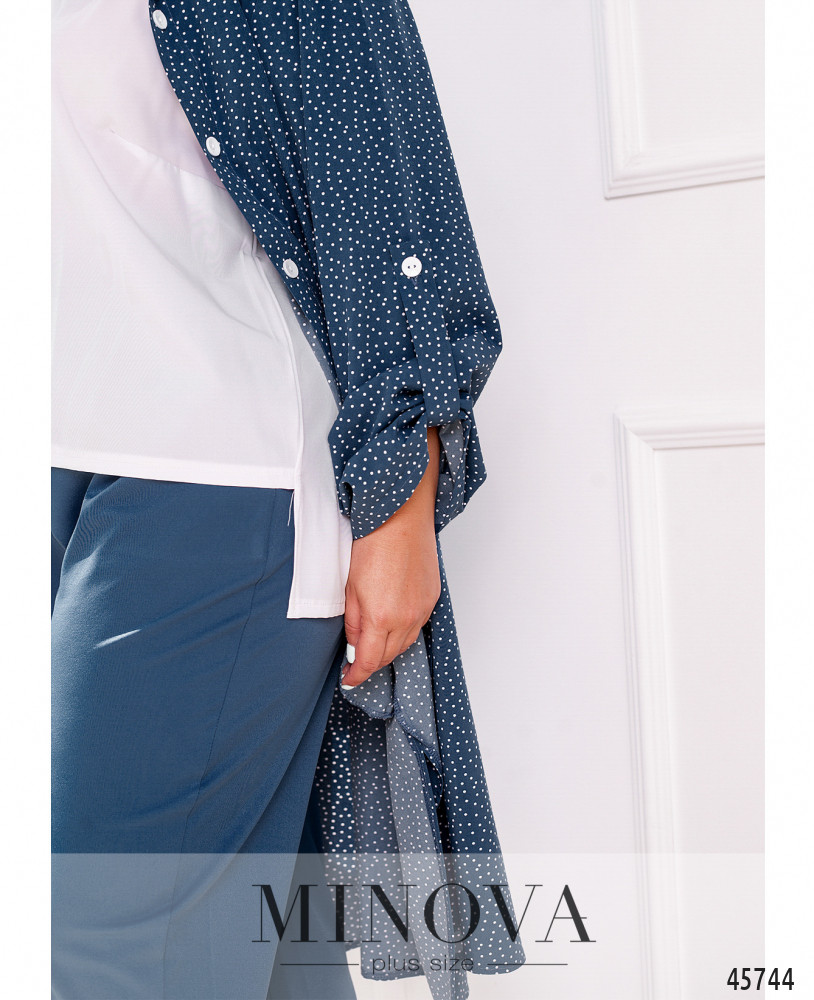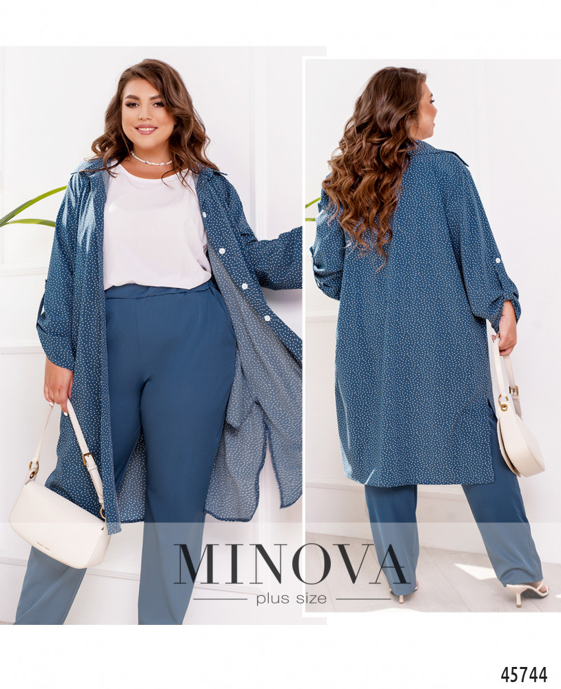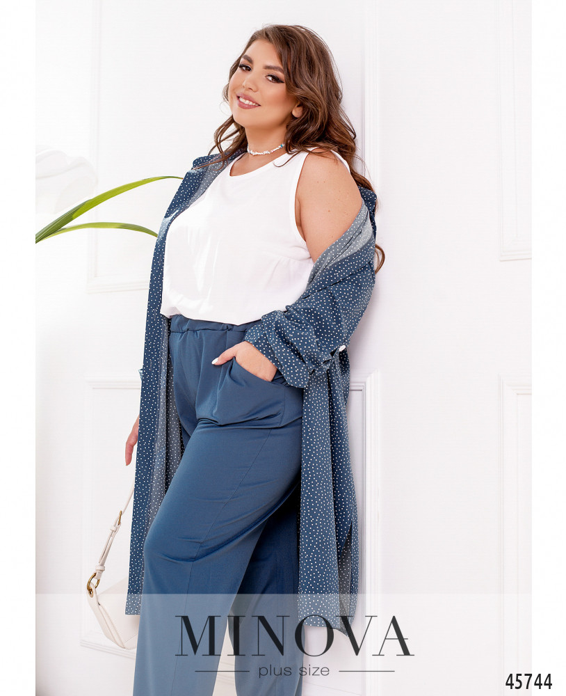 Яркий летний костюм-тройка – универсальное решение для любой модницы. В комплект входят брюки прямого кроя на резинке с карманами в боковых швах, выполненные из однотонной ткани, лаконичная белая майка и невесомая рубашка с актаульным принтом в горошек и рукавами длиной 3/4.