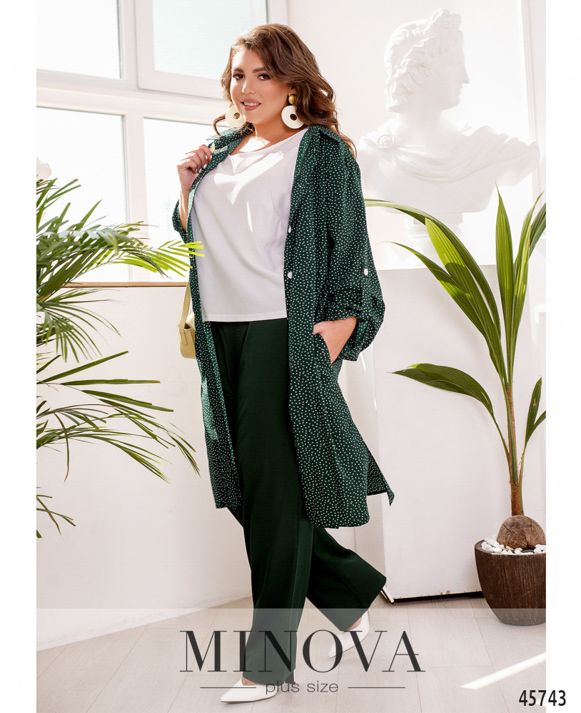 Яркий летний костюм-тройка – универсальное решение для любой модницы. В комплект входят брюки прямого кроя на резинке с карманами в боковых швах, выполненные из однотонной ткани, лаконичная белая майка и невесомая рубашка с актаульным принтом в горошек и рукавами длиной 3/4.