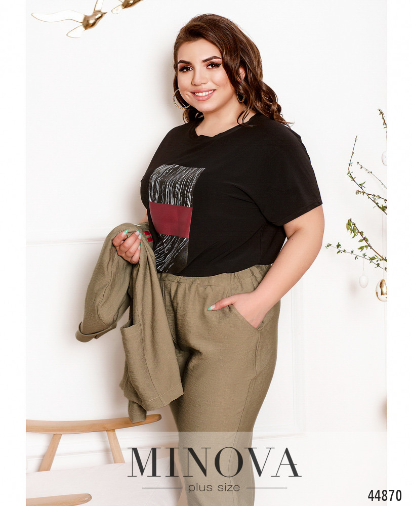 Стильный костюм-тройка батал в стиле casual. Пиджак с подкладкой от плеч до талии, застёгивается на одну пуговицу, в наличии подплечники, рукава без пуговиц, с отворотами. На спине продольный принт. По бокам - накладные карманы. Футболка с принтом, без застёжек и карманов, вырез горловины полукруглый. Брюки с отворотами, застёгиваются на пуговицу и молнию под змейкой, на талии шлейки для пояса, посадка высокая, по бокам - карманы в шве.