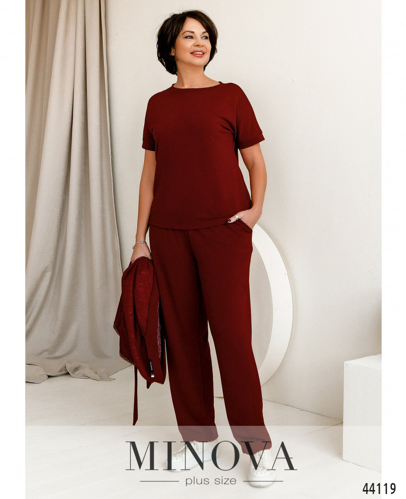 Стильный и комфортный костюм-тройка большого размера. Брюки с высокой талией, в пояс вшита резинка, по бокам - карманы в шве. Футболка без застёжек и карманов, рукава и горловина с мягким манжетом. Кардиган меланжевого оттенка с мягкой оторочкой полочек, в наличии пояс в тон и шлейки для него на талии. Без застёжек и подкладки, спереди накладные карманы.
