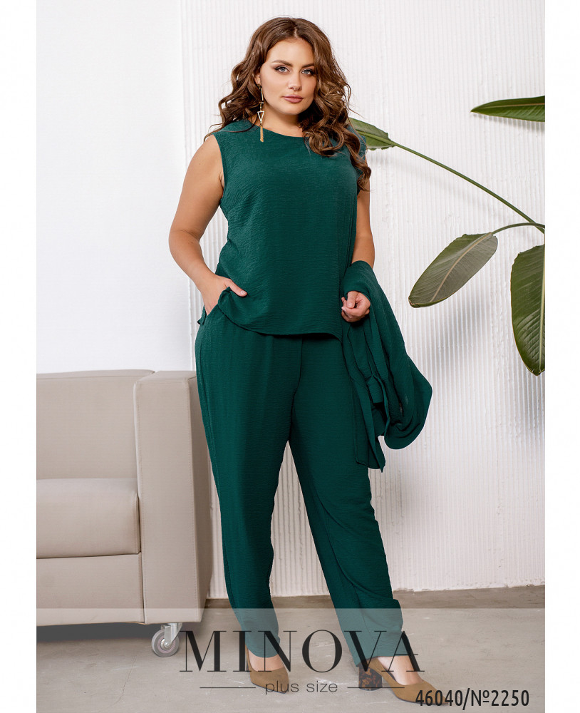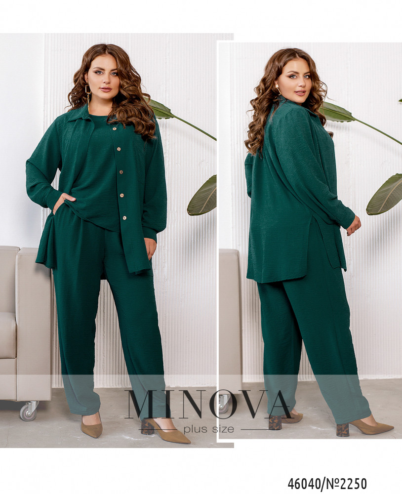 Элегантный и стильный костюм тройка большого размера. Верхняя рубашка удлинённая, с отложным воротничком, на груди накладной карман, по бокам - длинные разрезы. На рукавах манжеты, на манжетах по одной пуговке. Брюки с высокой талией, по бокам - карманы в шве, в пояс вшита резинка. Майка с полукруглым вырезом горловины, на груди вытачки, по бокам подола - разрезы. Без карманов и застежек.