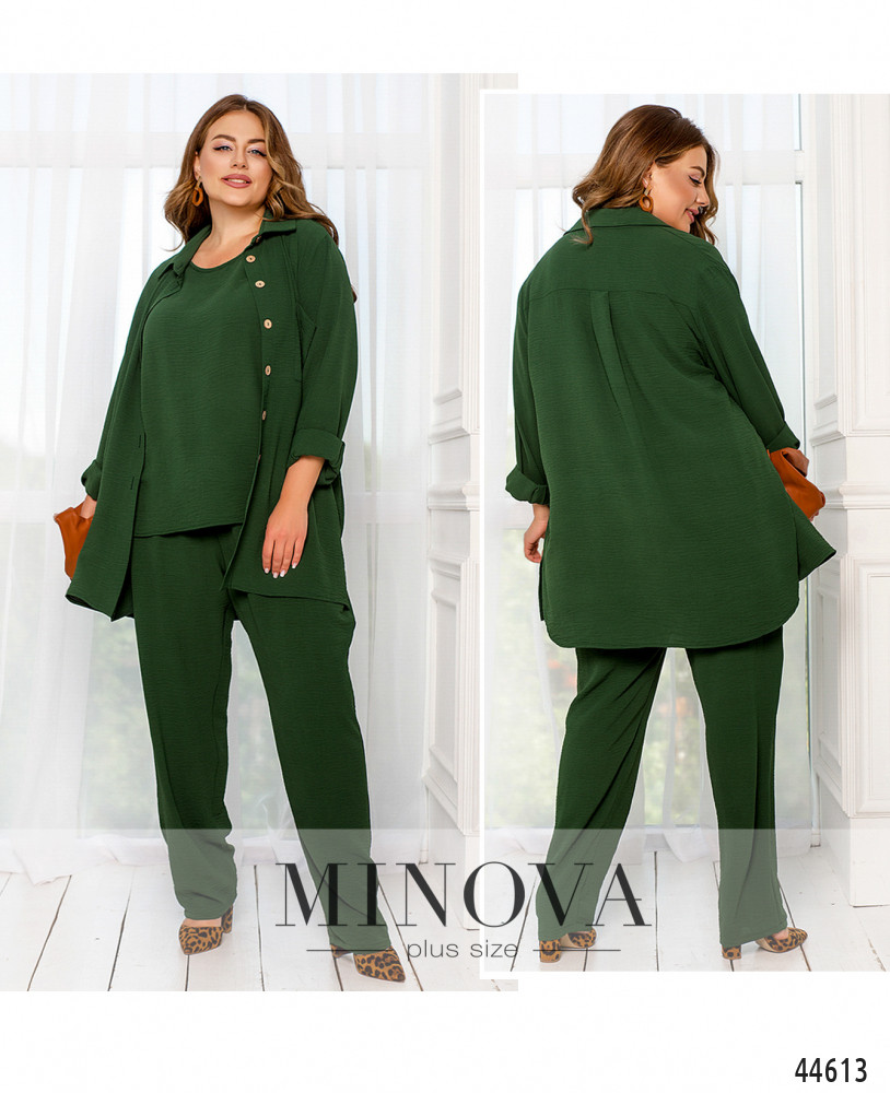 Элегантный и стильный костюм тройка большого размера. Верхняя рубашка удлинённая, с отложным воротничком, на груди накладной карман, по бокам - длинные разрезы. На рукавах манжеты, на манжетах по одной пуговке. Брюки с высокой талией, по бокам - карманы в шве, в пояс вшита резинка. Майка с полукруглым вырезом горловины, на груди вытачки, по бокам подола - разрезы. Без карманов и застежек.