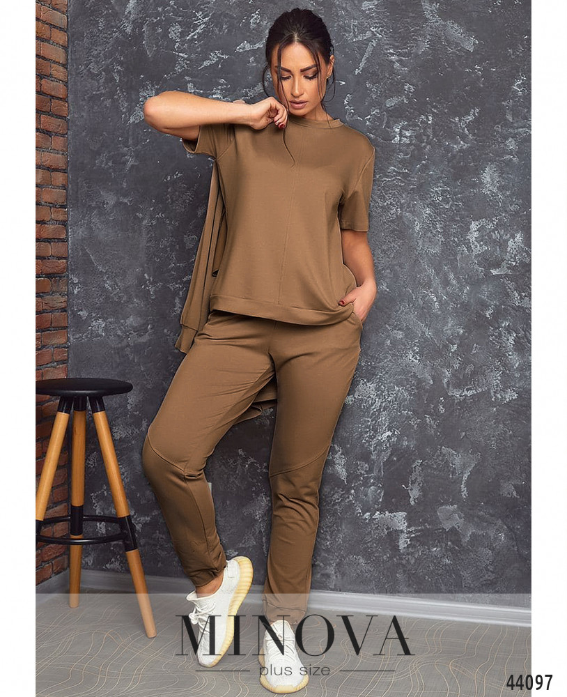 Удобный и стильный костюм-тройка плюс сайз, курточка длинная, со сквозной молнией спереди. На уровне груди - карманы в шве с цветной окантовкой, на спинке - длинная продольная лента. Рукава с мягкими манжетами. Футболка с манжетом на подоле и горловине, без застёжек и карманов. Брюки с высокой талией, по бокам карманы, в пояс и в манжеты вшита резинка. На бёдрах декоративные диагональные швы.