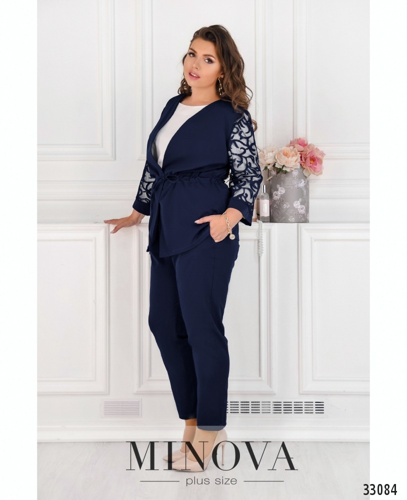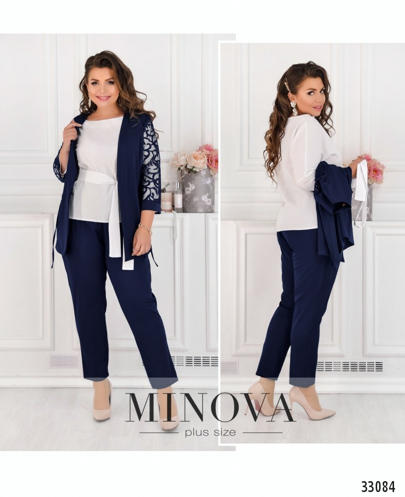 Нежный и элегантный костюм-тройка из каталога женской одежды от Minova вполне подойдёт для не слишком строгого офисного дресс-кода: цвета очень сдержанные, глубокие – синий, чёрный, бордо. В комплект входят брюки с удобной широкой резинкой на поясе, в наличии карманы; блуза без застёжек с двойными рукавами длиной ¾, и женственный жакет без карманов со вшитым поясом и гипюровыми рукавами. Крой полочек жакета полукруглый, без бортов. Ткань мягкая, приятная к телу, не тянется. Костюм такого фасона будет хорошо смотреться на любом типе фигуры.