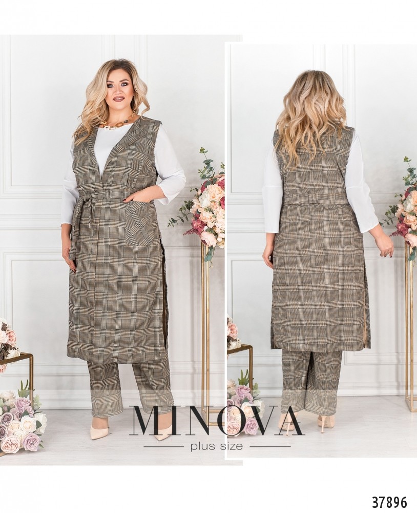 Стильный костюм-тройка батал с брюками, жилеткой и рубашкой. Брюки высокой посадки, в пояс вшита резинка, по бокам карманы. Рубашка без застёжек и карманов, с полукруглым вырезом горловины. Жилетка длинная, без застёжек, в комплекте пояс, по бокам – накладные карманы.