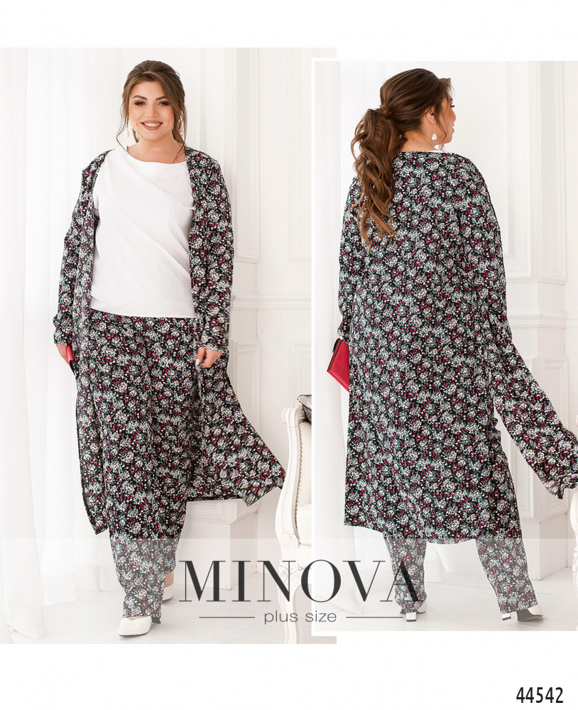 Яркий и оригинальный костюм-тройка батал. Кардиган без застёжек и карманов, рукава без манжет, на подоле по бокам очень длинные разрезы. Футболка с коротким рукавом, вырезом горловины "лодочка", без застёжек и карманов. Брюки с высокой посадкой, в пояс вшита резинка, по бокам - карманы в шве, застёжек нет.