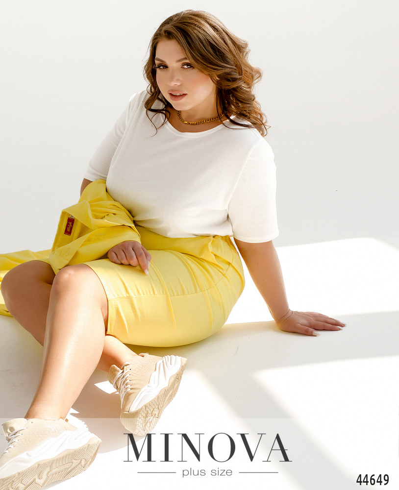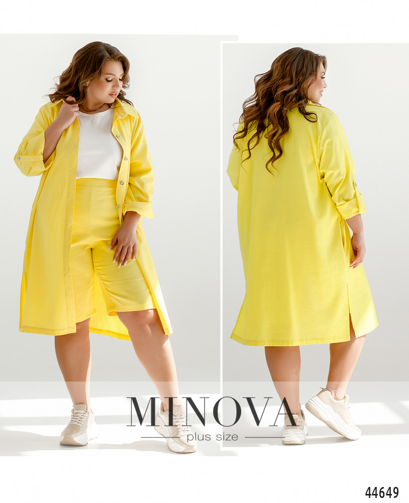 Оригинальный костюм-тройка батал. Верхняя рубашка мягкая, длинная, с разрезами по бокам подола. Воротничок отложной, застёжка - ряд пуговиц спереди на планке. Рукава регулируются на пуговку и ленту. По бокам - карманы в шве. Без подкладки. Шорты с высокой талией, по бокам - карманы в шве, резинка вшита сзади в пояс, застёжек нет. Футболка с коротким рукавом, удлинённая, вырез горловины полукруглый, без застёжек и карманов.