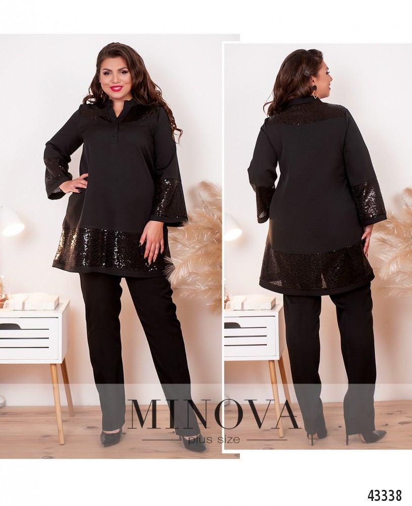Яркий костюм-двойка плюс сайз. Блуза с пуговицами на груди, воротник невысокий, карманов нет. На верхней части груди и спинки, а также на подоле и на месте манжет - широкие вставки сеточки с пайетками. Брюки с высокой талией, по бокам - врезные карманы, в пояс вшита резинка.