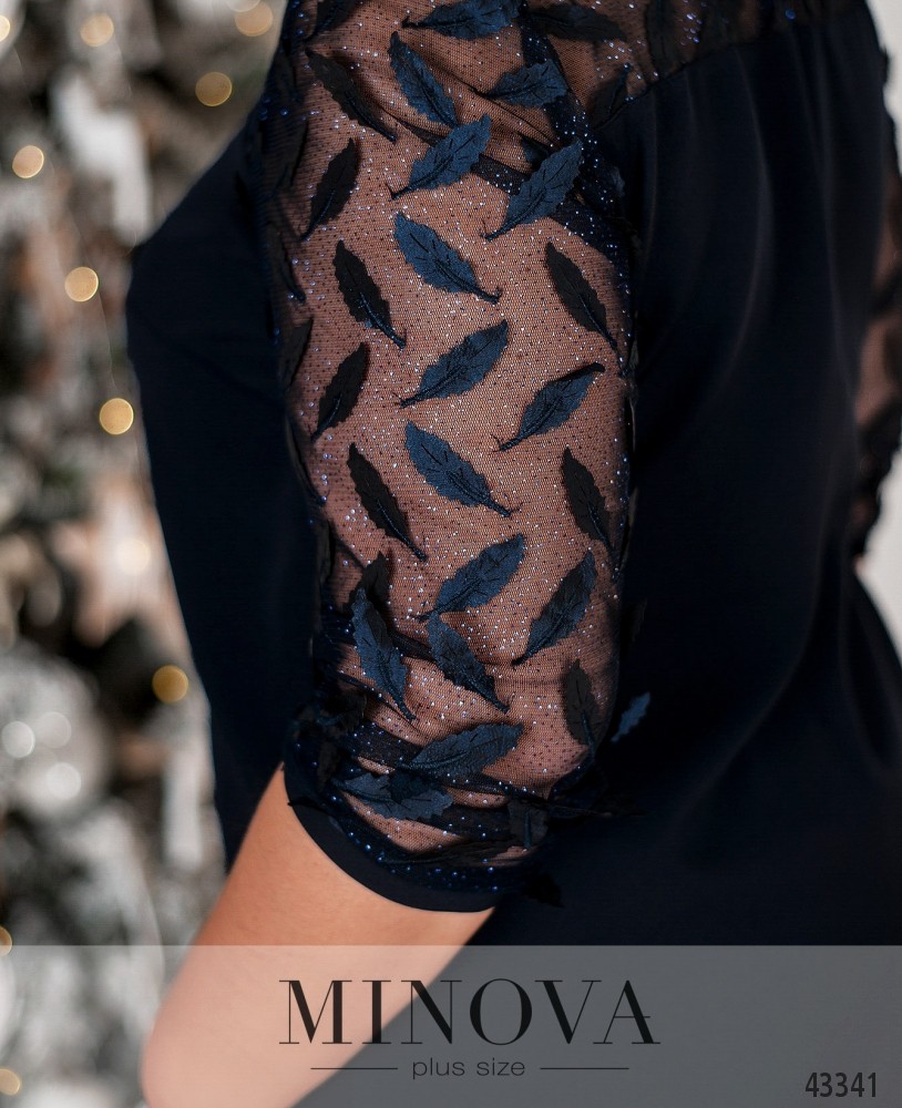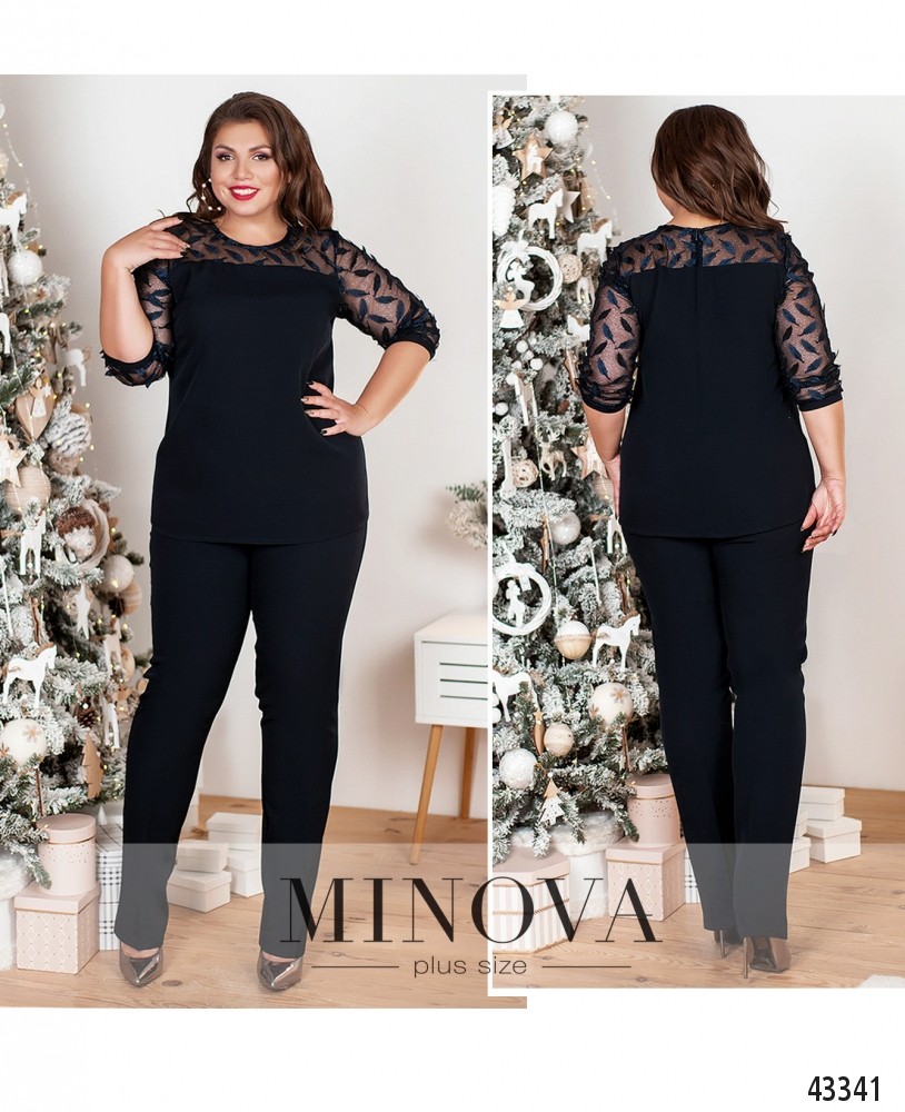 Привлекательный костюм-двойка плюс сайз, рукава и верх блузы - из полупрозрачной сеточки, украшенной аппликациями-листьями. Застёжка - молния, вшитая по спинке. На груди вытачки, карманов нет. Брюки со вшитой в пояс сзади резинкой, посадка высокая, карманов нет.