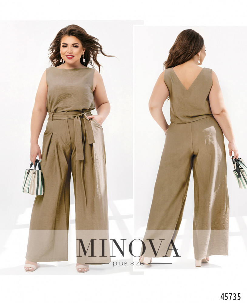 Минималистичный и оригинальный костюм, брюки расклешены, талия высокая, есть шлейки для пояса. Застёжка - молния под ширинкой и пуговка на талии. По бокам - карманы в шве, сзади на бёдрах от талии продольные вытачки. Топ без рукавов, карманов и застёжек, без резинки, вырез горловины сзади V-образный, спереди полукруглый.
