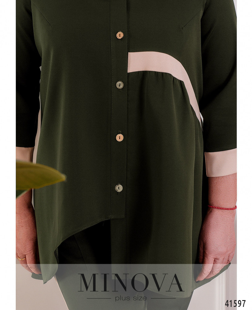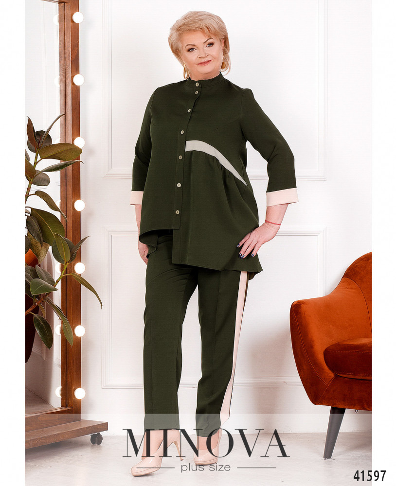 Стильный и элегантный костюм-двойка батал с оригинальной блузой. Блуза с асимметричным подолом: слева чуть длиннее. Слева на талии лента, от неё подол ниспадает мягкими оборками. Карманов нет. Застёгивается на ряд пуговиц от небольшого воротника до подола. Брюки с пуговицей и молнией под ширинкой, по бокам - врезные карманы и контрастные лампасы, в пояс сзади вшита резинка. Посадка высокая.