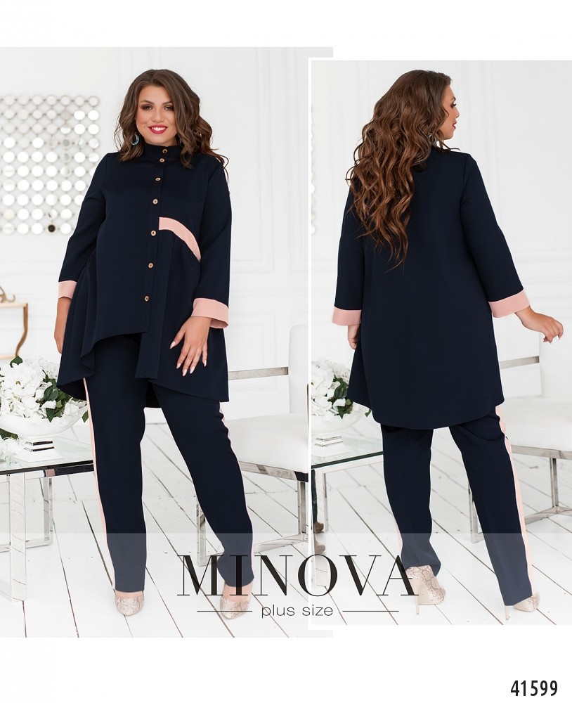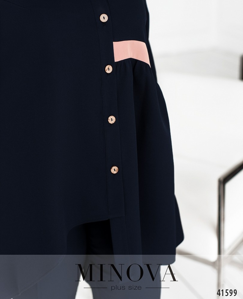 Стильный и элегантный костюм-двойка батал с оригинальной блузой. Блуза с асимметричным подолом: слева чуть длиннее. Слева на талии лента, от неё подол ниспадает мягкими оборками. Карманов нет. Застёгивается на ряд пуговиц от небольшого воротника до подола. Брюки с пуговицей и молнией под ширинкой, по бокам - врезные карманы и контрастные лампасы, в пояс сзади вшита резинка. Посадка высокая.
