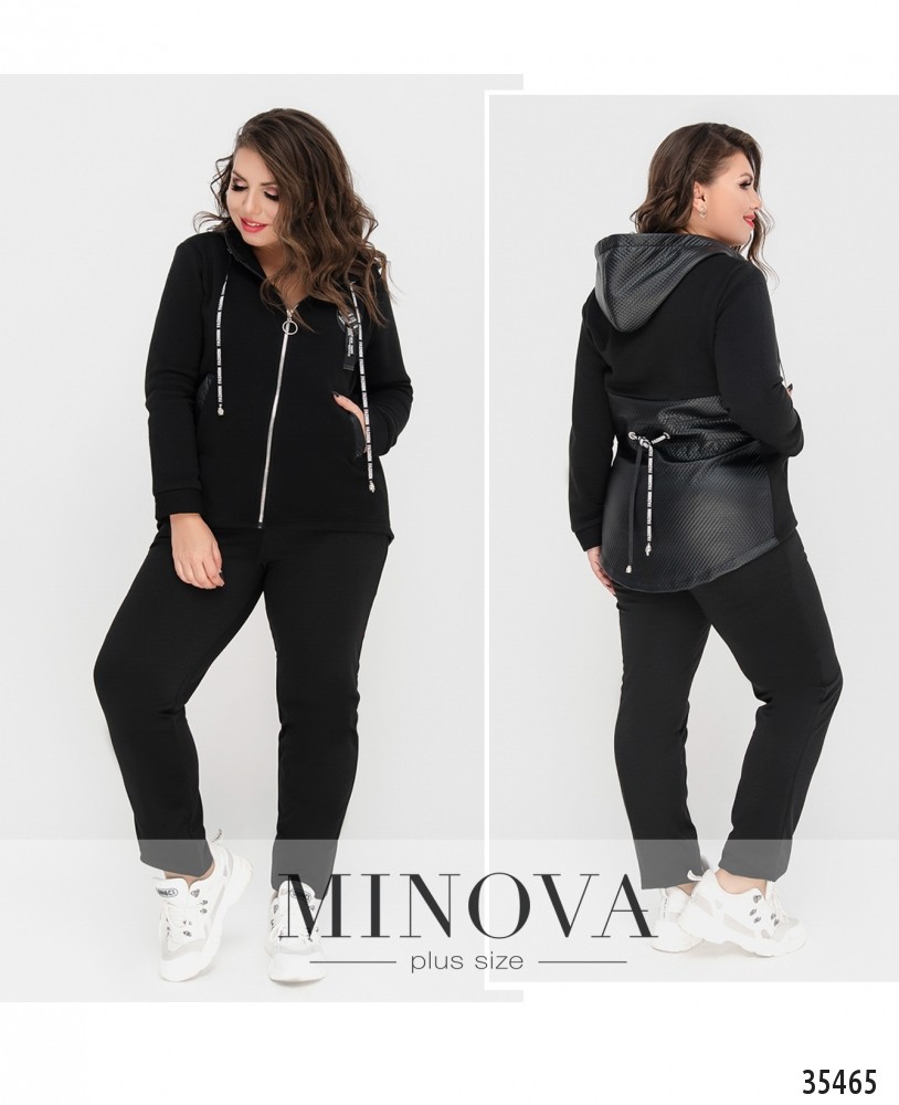 Тёплый и мягкий, из плотной ткани, полу-спортивный, полу-городской костюм-двойка от Minova представлен в свежем пополнении коллекции. В комплекте кофта и брюки. Кофта длинная, с капюшоном, рукава полной длины. По бокам – врезные карманы. Карманы и капюшон выполнены из простёганной ткани типа плащовки, и такая же ткань покрывает сзади спину от пояса до низу. Через талию по спине пропущен шнурок, который можно затянуть и приталить силуэт. На левой стороне груди – декоративный круглый элемент с ремешком. Брюки с резинкой в поясе, высокая посадка, по бокам карманы, крой прямой. Подходящий вариант для дома или для прогулок.
