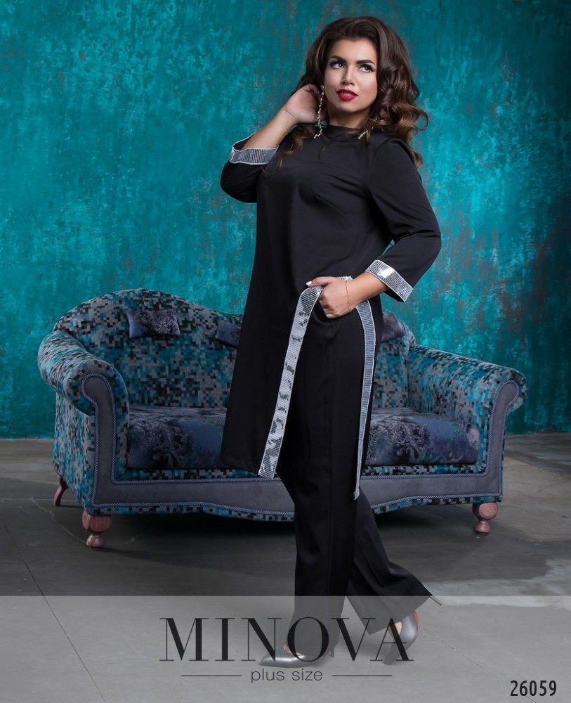 Яркий праздничный костюм-двойка с эффектными пайетками. Длинная туника с рукавами ¾ и асимметричным разрезом от бедра. Разрез и манжеты обшиты пайетками. Прямые брюки с карманами на высокой посадке. Пояс брюк представлен планкой на лицевой стороне и резинкой – на спинке. Линия шага оформлена декоративной ширинкой.
