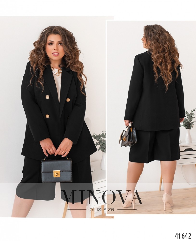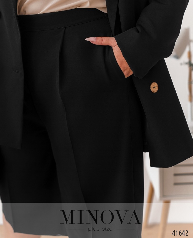 Минималистичный и в то же время оригинальный костюм-двойка батал. Пиджак с резными лацканами, двубортный, застёгивается на левый ряд пуговиц (кроме верхней). Рукава без пуговиц. На груди вытачки. В наличии подкладка и подплечники. По бокам - врезные карманы. Брюки со вшитой сзади в пояс резинкой, спереди - пуговица и молния под ширинкой. Брюки с наглаженными стрелочками. По бокам - врезные карманы.