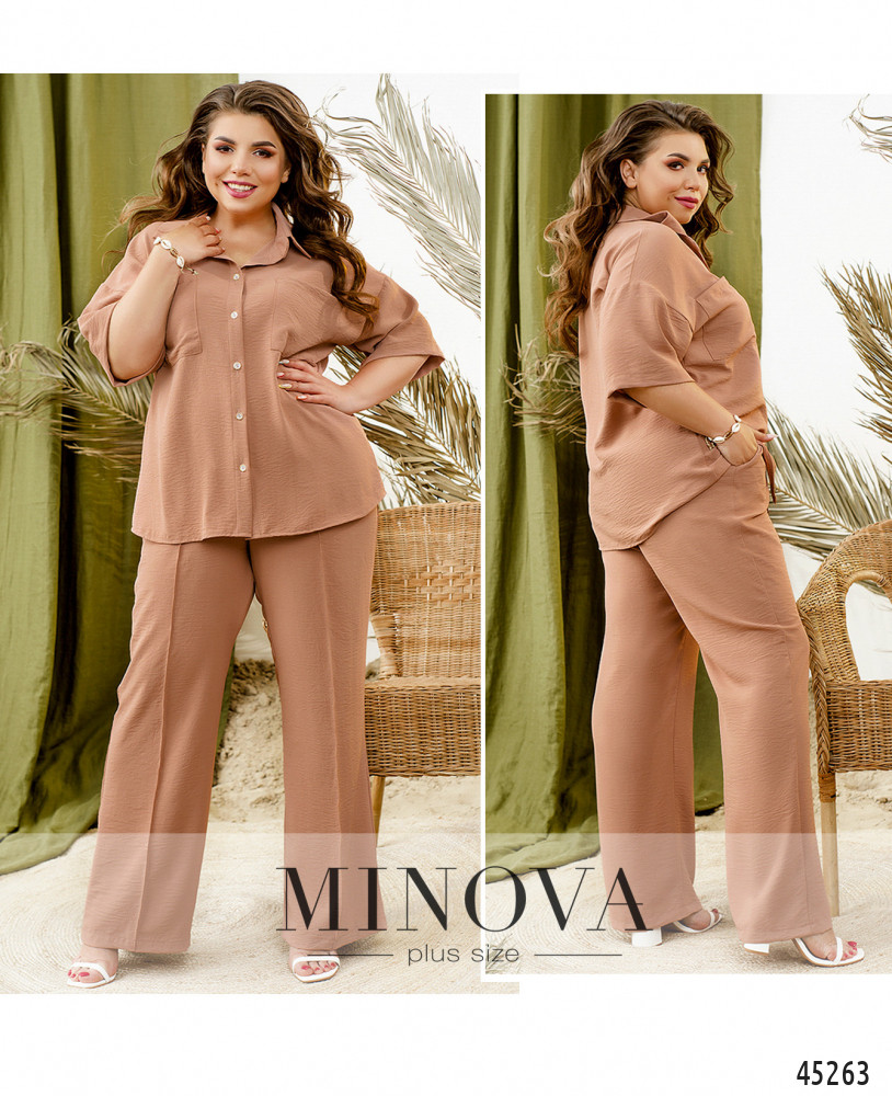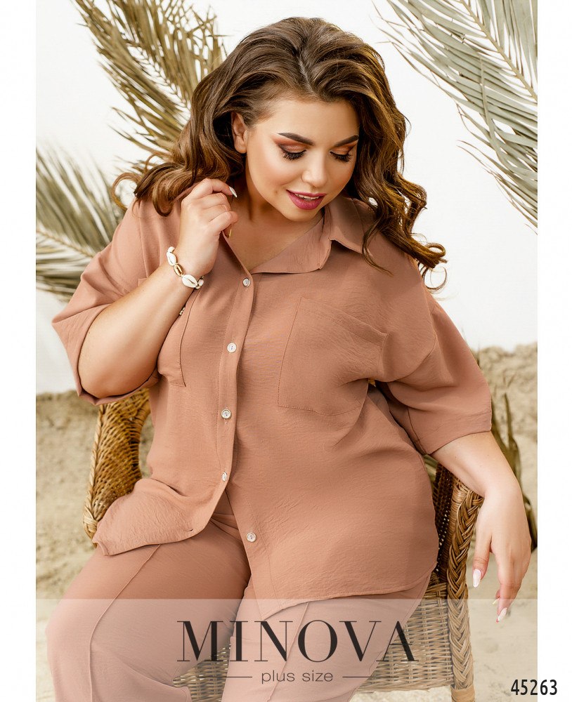 Актуальный лаконичный костюм-двойка станет универсальным дополнением вашего базового гардероба. В комплект входит легкая блуза-рубашка с классическим воротником, накладными карманами на груди и пуговицами спереди на планке. Универсальная длина рукава 3/4 с приспущенной линией плеча позволит вам чувствовать себя комфортно в этой рубашке не только летом, но и ранней осенью, а так же поздней весной. Невесомые брюки прямого кроя на резинке дополнены карманами и швами спереди, имитирующими стрелки.