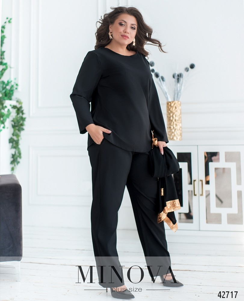 Стильный костюм-тройка батал с накидкой. Накидка полупрозрачная, от плеча - длинные разрезы, без рукавов. Декорирована манжетом с пайетками с обеих сторон. Вырез горловины полукруглый, застёжек и карманов нет. Блуза без застёжек и карманов, рукава без манжет, по бокам подола - небольшие разрезы, на груди вытачки. Брюки с высокой талией, в пояс сзади вшита резинка, по бокам врезные карманы, без застёжек.