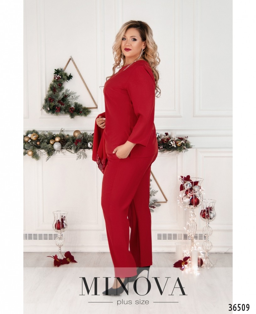 Очень нарядный, оригинальный и праздничный костюм-тройка из свежей коллекции женской одежды от Minova идеально подходит для девушек с «грушевой» фигурой или мелкими несовершенствами. Всё благодаря накидке-пончо из очень лёгкой ткани, накидка с широким полукруглым вырезом горловины, по подолу оторочена рядом блестящих пайеток, карманов и застёжек нет, по бокам – небольшие разрезы. Топ без застёжек и карманов, с вытачками на груди, рукавами длиной ¾, из мягкой лёгкой ткани. Брюки со вшитой в пояс резинкой и врезными карманами по бокам, посадка высокая, крой прямой. Сделайте свой образ по-настоящему незабываемым, дополнив его подходящими украшениями и обувью!