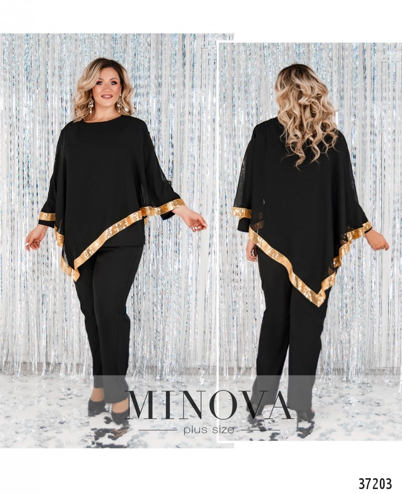 Очень нарядный, оригинальный и праздничный костюм-тройка из свежей коллекции женской одежды от Minova идеально подходит для девушек с «грушевой» фигурой или мелкими несовершенствами. Всё благодаря накидке-пончо из очень лёгкой ткани, накидка с широким полукруглым вырезом горловины, по подолу оторочена рядом блестящих пайеток, карманов и застёжек нет, по бокам – небольшие разрезы. Топ без застёжек и карманов, с вытачками на груди, рукавами длиной ¾, из мягкой лёгкой ткани. Брюки со вшитой в пояс резинкой и врезными карманами по бокам, посадка высокая, крой прямой. Сделайте свой образ по-настоящему незабываемым, дополнив его подходящими украшениями и обувью!