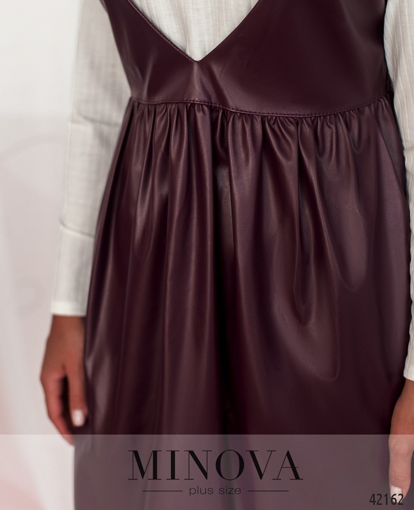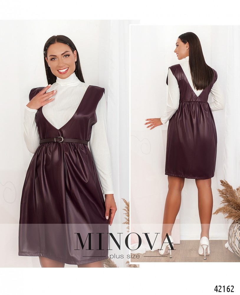 Привлекательный и нестандартный костюм-двойка батал с сарафаном и гольфом. Гольф без застёжек, рукава без манжет. Сарафан без застёжек, по бокам врезные карманы.