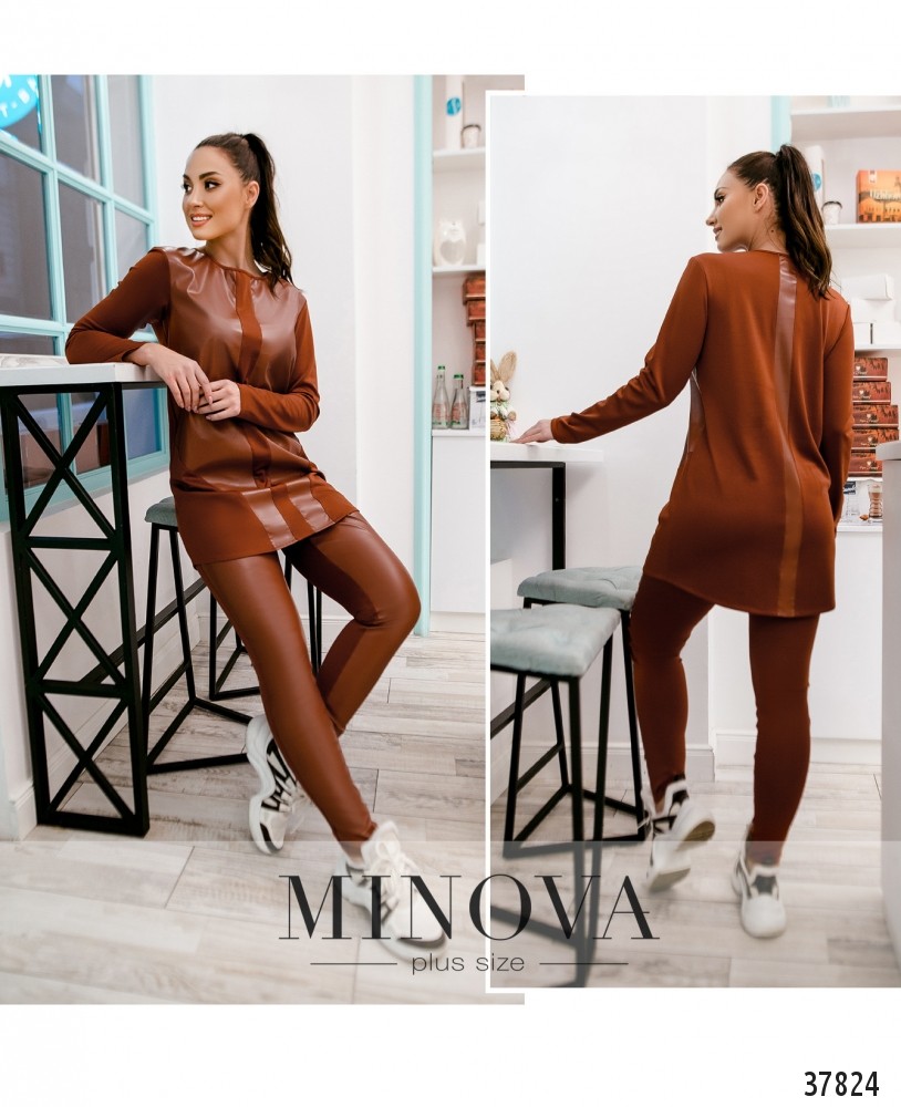 Стильный костюм-двойка с брюками и длинной кофтой. Кофта без застёжек и карманов, спереди из эко-кожи, со вставками мягкой ткани, спинка мягкая. Рукава без манжет, вырез горловины полукруглый. Брюки без карманов, высокая посадка, в пояс вшита резинка.
