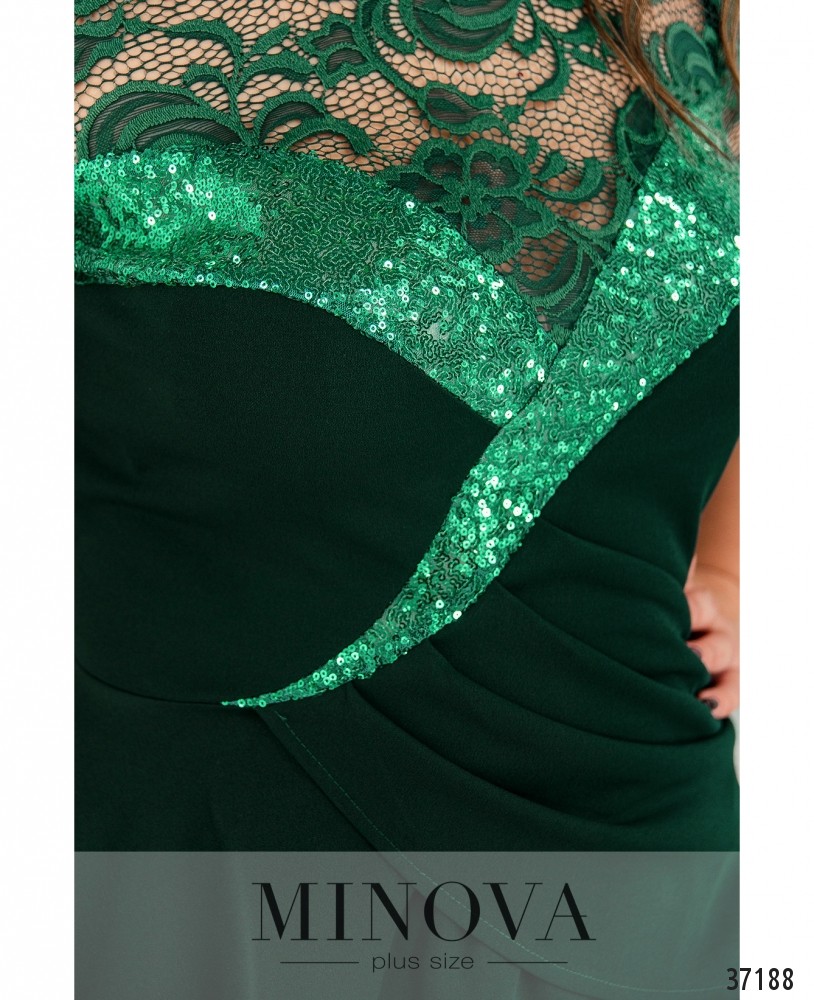 Оригинальный праздничный костюм-двойка батал. Блуза с асимметричным, сильно скошенным влево подолом, подшитым к середине спереди. Грудь декорирована широкой лентой пайеток. Сверху полупрозрачный гипюр, рукава длиной до локтя, из гипюра без подкладки. Вырез горловины полукруглый. Застёгивается на вшитую по спине молнию. Юбка прямого кроя без карманов, молния вшита по спине.