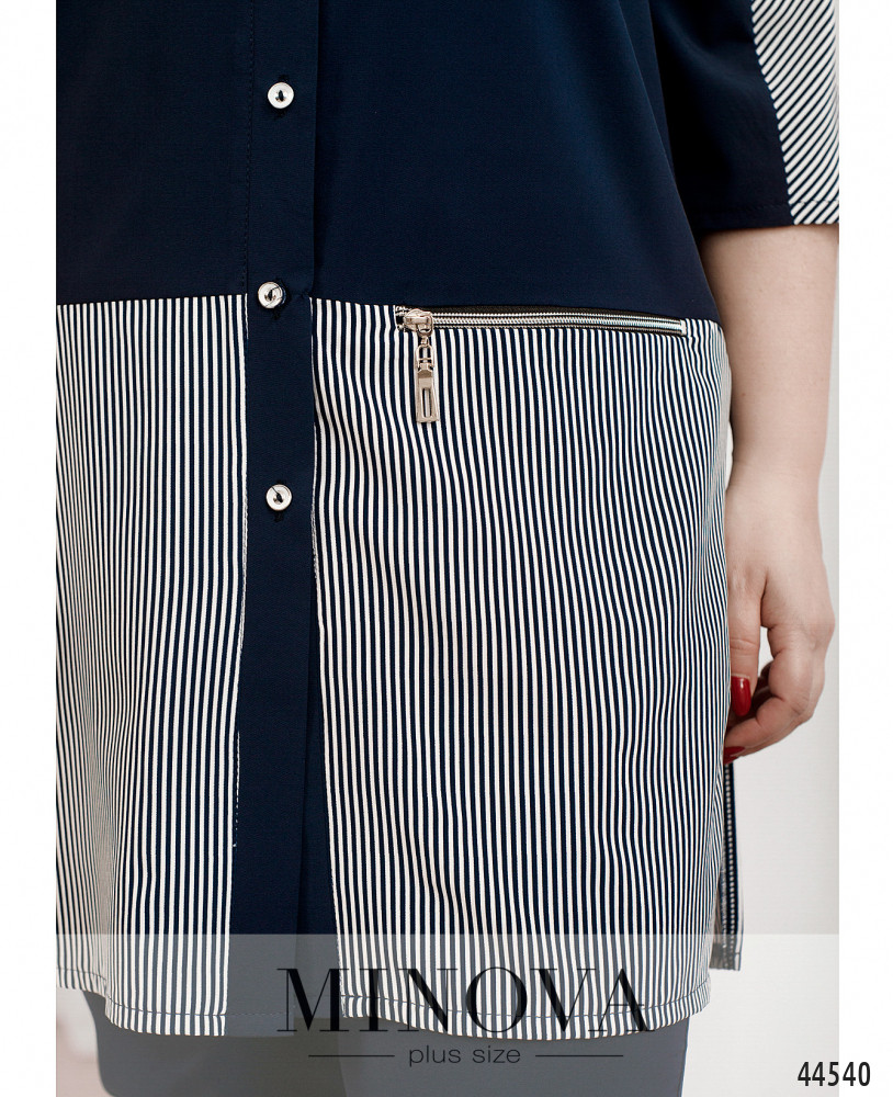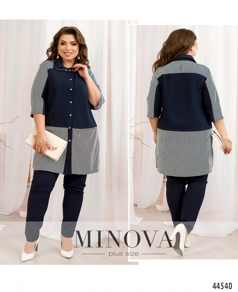 Стильный костюм-двойка батал, рубашка с контрастными вставками и отложным воротничком, застёгивается на ряд пуговиц спереди на планке. Слева - прорезной карман в рамку, под молнией. По бокам подола - разрезы. Рукава без манжет. Брюки с высокой талией, в пояс вшита резинка, по бокам - карманы в шве. Застёжек нет.