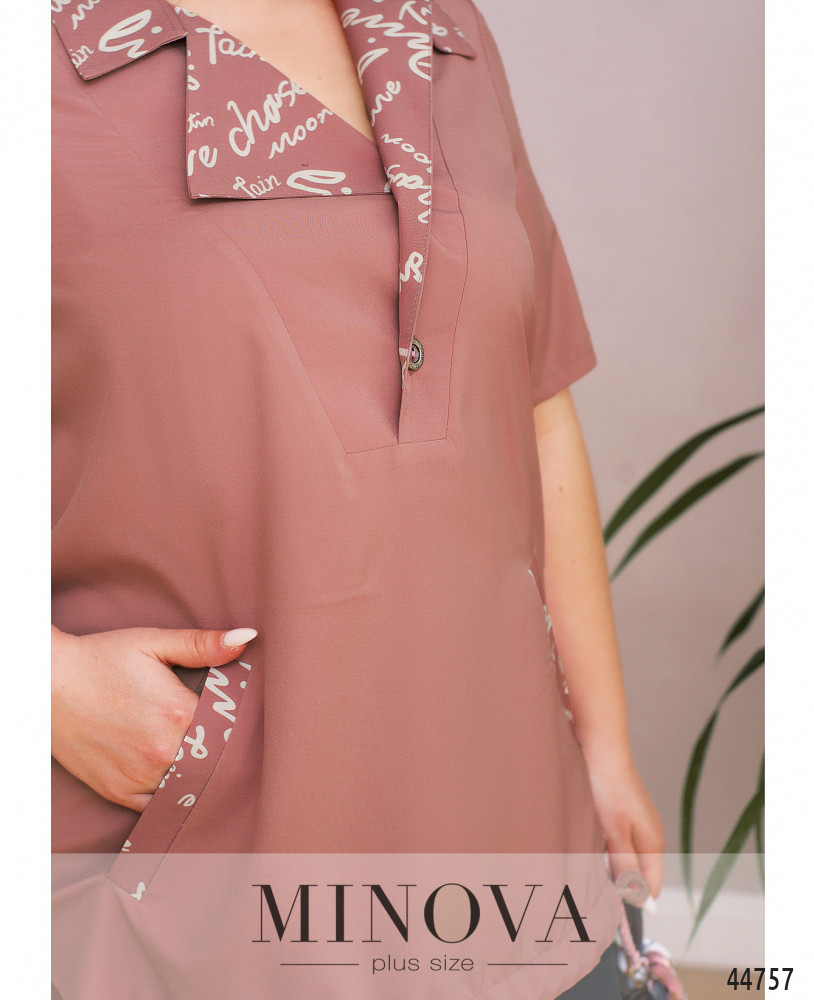 Яркий и стильный костюм батал, блуза с отложным широким воротничком, декорированным принтом. Такой же принт на декоративных регулировочных лентах и на листочках карманов в шве, а также на подоле. Через подол пропущен шнурок. Застёжка - ряд пуговиц до груди, рукава без манжет. Брюки с высокой талией, в пояс вшита резинка, по бокам - карманы в шве, без застёжек.