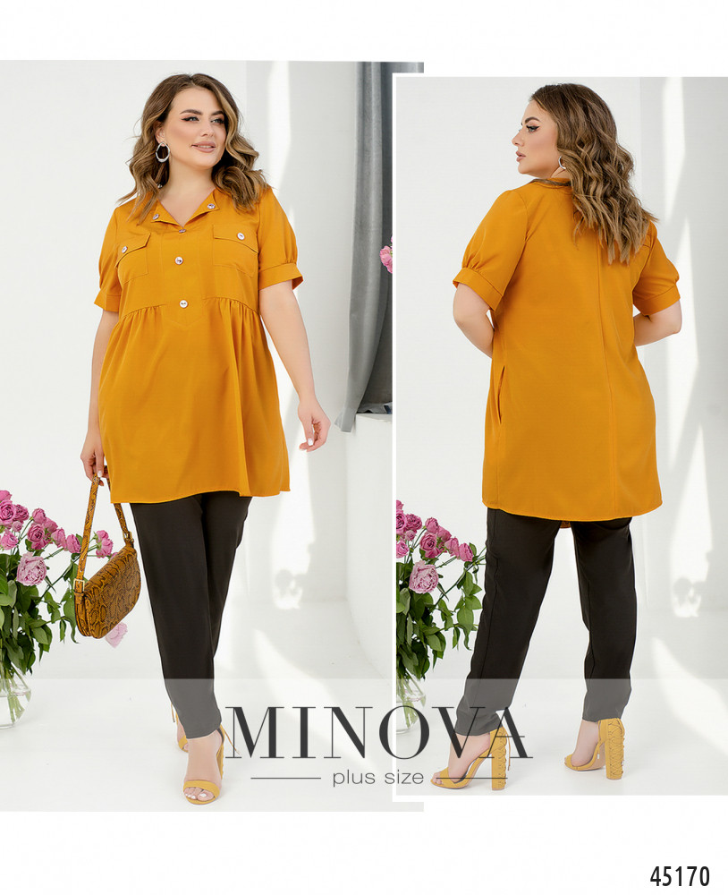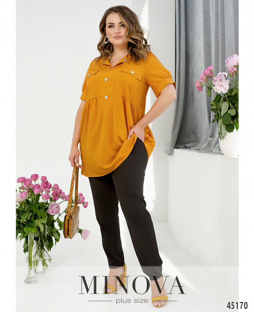 Яркий контрастный костюм с блузой-туникой и темными брюками поможет создать запоминающийся элегантный образ. Удлиненная приталенная блуза-туника насыщенного цвета с V-образным вырезом, нагрудными накладными карманами и короткими рукавами с манжетами является выразительным акцентом в данном костюме. Ее идеально дополняют минималистичные темные брюки на резинке. И блуза, и брюки дополнены карманами в боковых швах для вашего удобства.