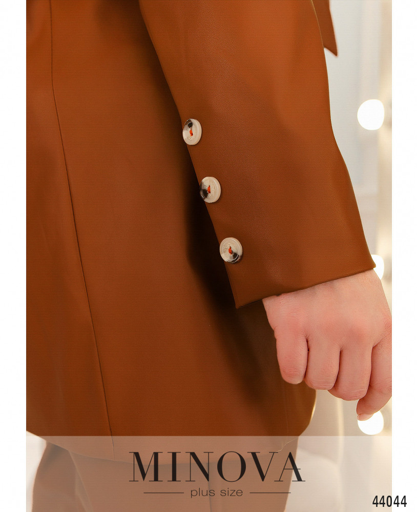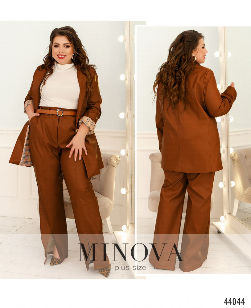 Элегантный и оригинальный костюм-двойка. Жакет однобортный, с двумя пуговицами, с яркой подкладкой. На рукавах - по три пуговицы на месте манжет. Спереди прорезные карманы под клапаном. Лацканы резные. Брюки с высокой посадкой, застёгиваются на пуговку и молнию под ширинкой, по бокам - карманы в шве.