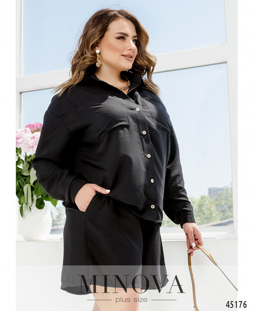Лаконичный однотонный костюм с классической рубашкой и короткими шортами - must have этого сезона. Легкая рубашка с отложным воротником и накладными карманами выполнена из тонкой летней ткани. Минималистичные шорты в тон рубашки на резинке с карманами в боковых швах идеально дополняют комплект.