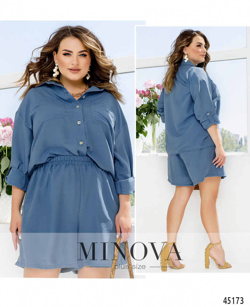 Лаконичный однотонный костюм с классической рубашкой и короткими шортами - must have этого сезона. Легкая рубашка с отложным воротником и накладными карманами выполнена из тонкой летней ткани. Минималистичные шорты в тон рубашки на резинке с карманами в боковых швах идеально дополняют комплект.