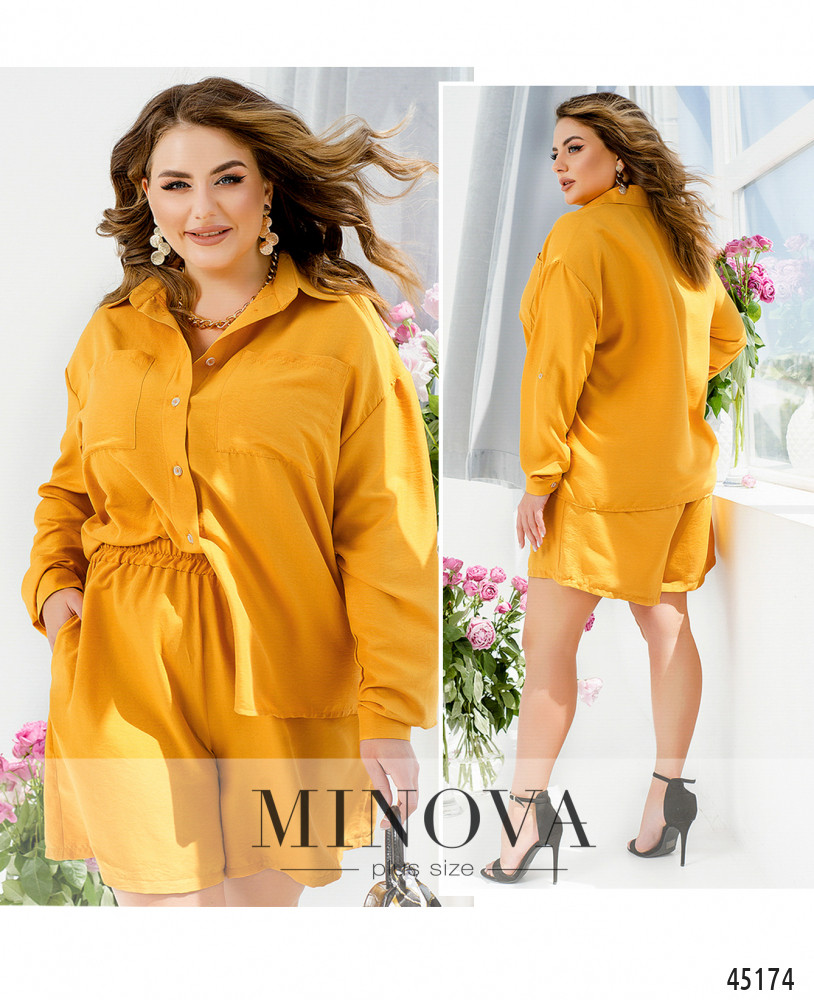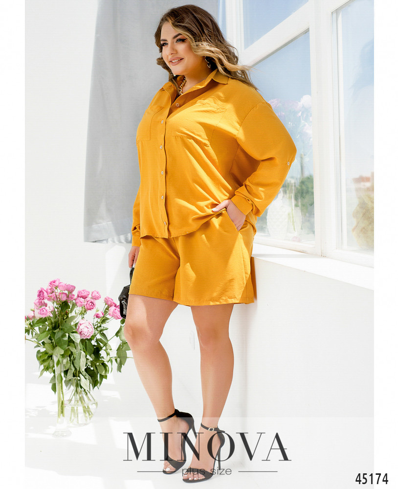 Лаконичный однотонный костюм с классической рубашкой и короткими шортами - must have этого сезона. Легкая рубашка с отложным воротником и накладными карманами  выполнена из тонкой летней ткани. Минималистичные шорты в тон рубашки на резинке с карманами в боковых швах идеально дополняют комплект.