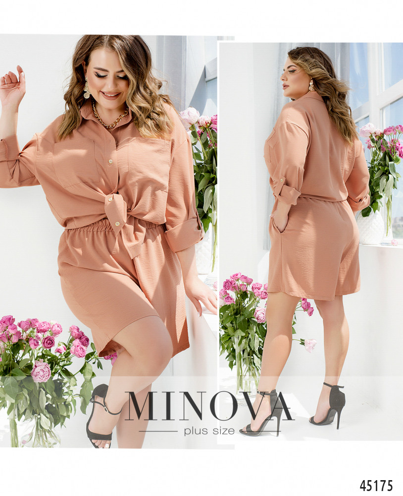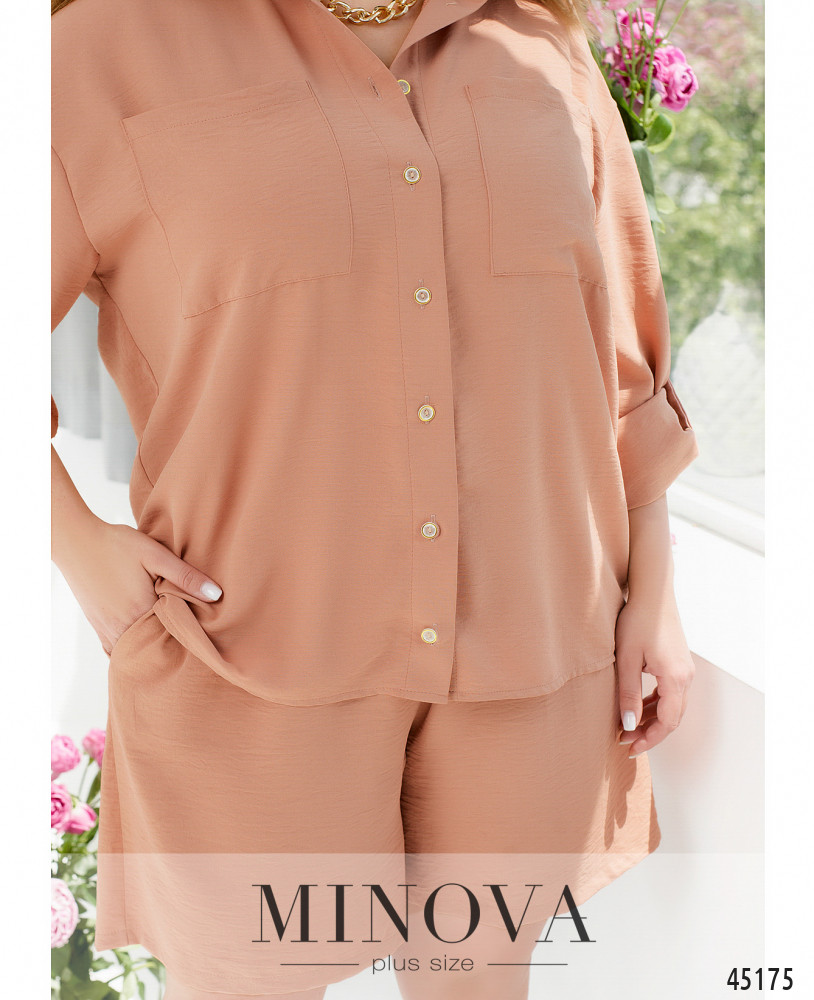 Лаконичный однотонный костюм с классической рубашкой и короткими шортами - must have этого сезона. Легкая рубашка с отложным воротником и накладными карманами  выполнена из тонкой летней ткани. Минималистичные шорты в тон рубашки на резинке с карманами в боковых швах идеально дополняют комплект.