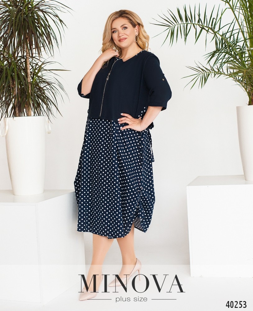 Оригинальный костюм большого размера, в комплекте - платье и накидка с молнией. Платье без рукавов, без застёжек и карманов, по бокам присобрано. Кофточка с регулируемыми рукавами, по бокам - разрез и подшиты ленты, которые можно завязать бантом. Без карманов.