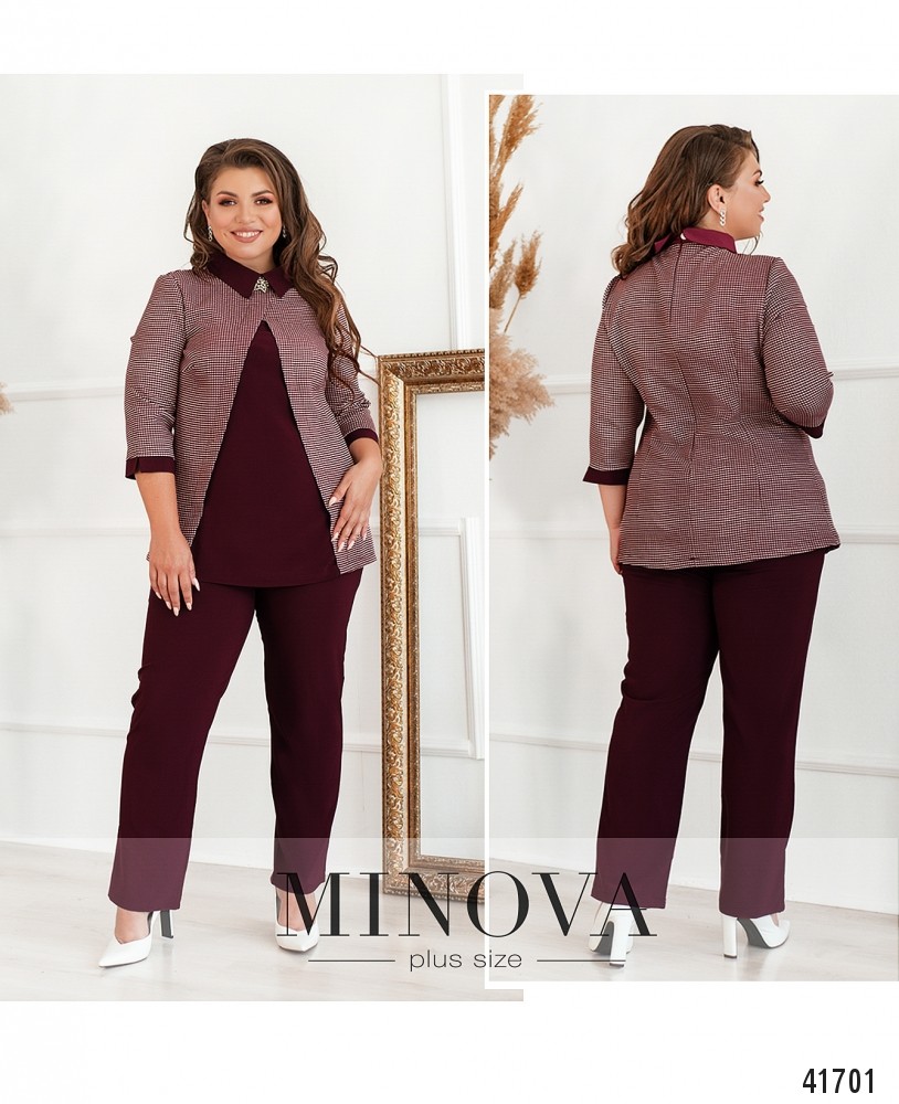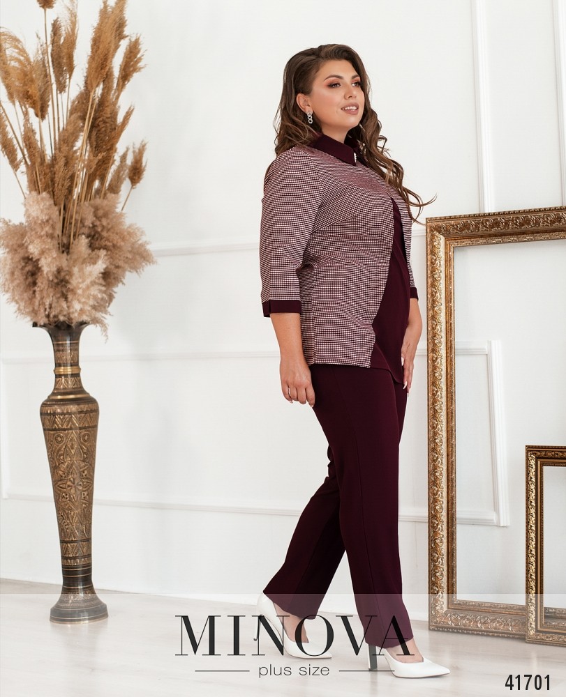 Нарядный костюм-двойка большого размера с блузой и брюками. Блуза без карманов, застёгивается на молнию, вшитую по спинке. На груди вытачки, рукава с контрастными манжетами с небольшими разрезами на манжетах. Воротничок отложной. Брюки с высокой талией, в пояс вшита резинка, по бокам врезные карманы, без манжет.