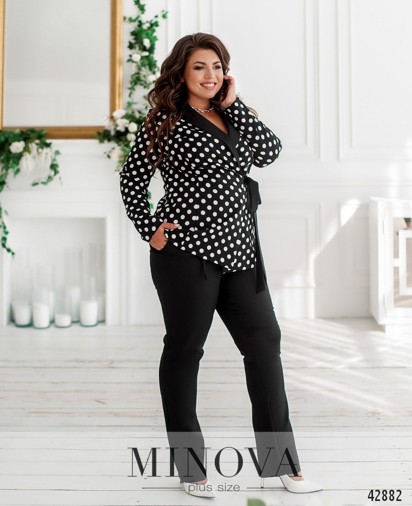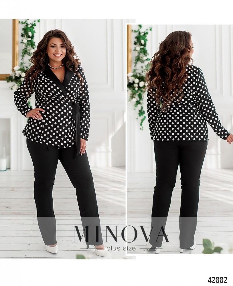 Привлекательный костюм-двойка большого размера. Пиджак без подкладки, завязывается на ленты по внешней стороне и на тесёмки - по внутренней. Спереди продольные вытачки. Лацканы резные. Карманов нет. Брюки с высокой талией, в пояс вшита резинка, по бокам - врезные карманы.