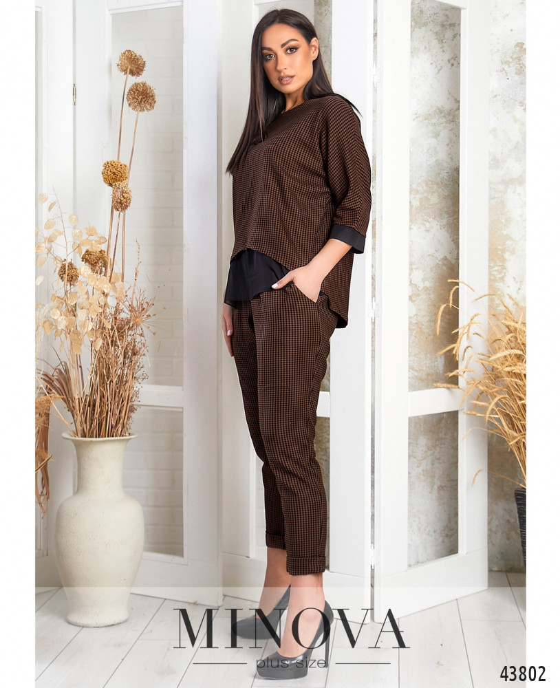 Женственный костюм плюс сайз, блуза без застёжек и карманов, рукава с мягкими манжетами, на подоле снизу полупрозрачная вставка. Брюки с высокой талией, в пояс вшита резинка, снизу небольшие манжеты-отвороты, по бокам карманы.