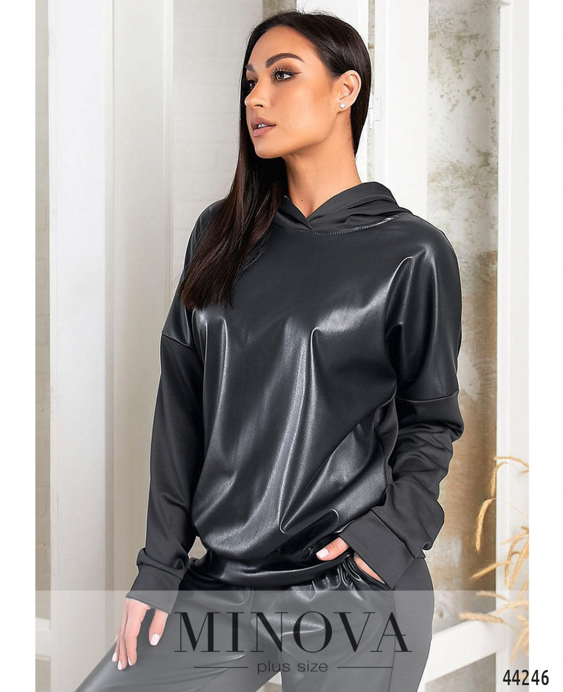 Оригинальный костюм батал из эко-кожи с добавлением ткани дайвинг. Толстовка с капюшоном без шнурков, рукава из мягкой ткани, снизу манжет на подоле. Карманов и застёжек нет. Брюки с высокой талией, по бокам карманы в шве, снизу манжеты, в пояс вшита резинка. Задняя часть брючин из мягкой ткани.