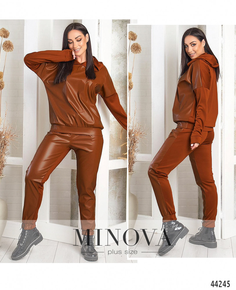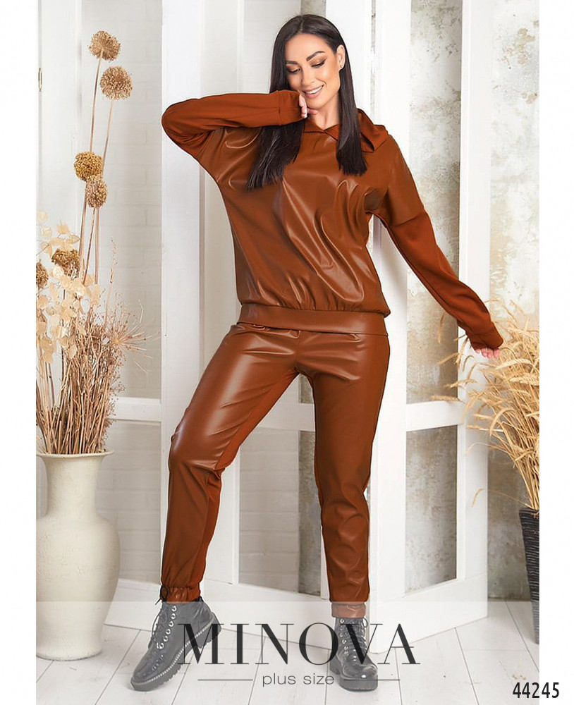 Оригинальный костюм батал из эко-кожи с добавлением ткани дайвинг. Толстовка с капюшоном без шнурков, рукава из мягкой ткани, снизу манжет на подоле. Карманов и застёжек нет. Брюки с высокой талией, по бокам карманы в шве, снизу манжеты, в пояс вшита резинка. Задняя часть брючин из мягкой ткани.