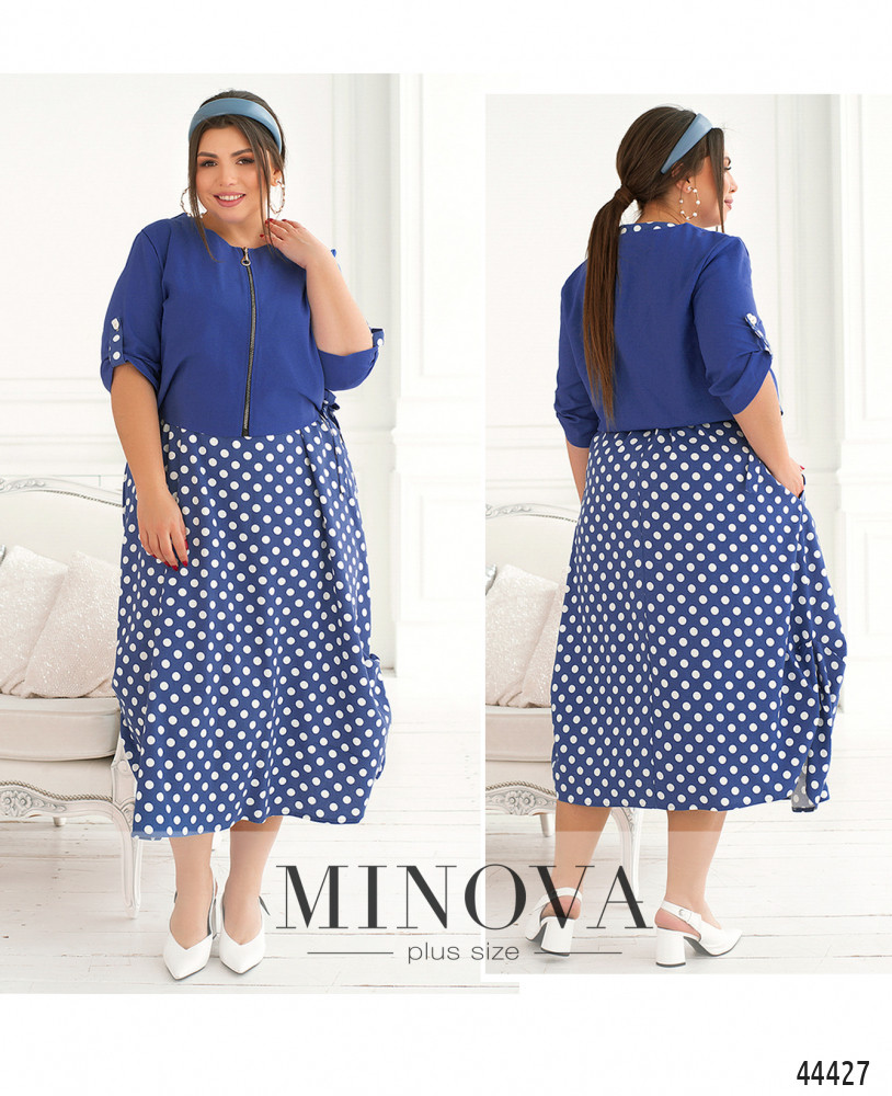 Нестандартный костюм-двойка батал. Верхняя кофточка с полукруглым вырезом горловины, застёгивается на сквозную молнию спереди по центру, без карманов. Рукава без манжет, регулируются на пуговку и ленту. По бокам подола - длинные ленты-завязки на небольших разрезах. Платье фасона "баллон", на подоле по бокам ткань присобрана. Вырез горловины полукруглый, застёжек нет, по бокам - карманы в шве. Без рукавов.