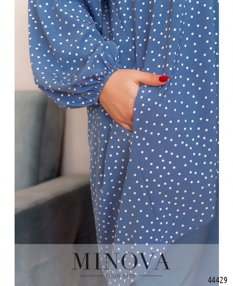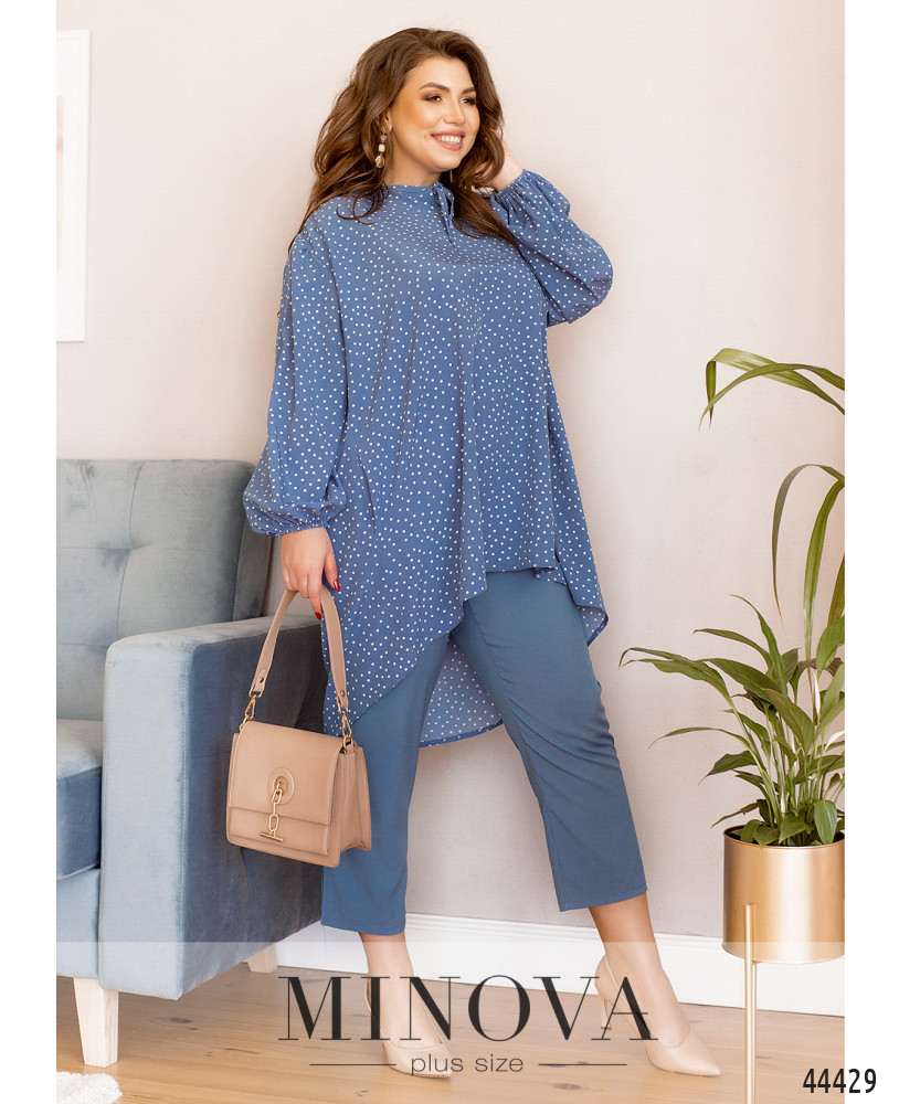 Стильный и оригинальный костюм батал. Блуза свободная, с широким вырезом горловины и двумя лентами-завязками. Рукава со вшитыми в манжеты резинками. Подол асимметричный, по спинке длиннее. По бокам - карманы в шве. Застёжек нет. Брюки с высокой талией, в пояс вшита резинка, по бокам - карманы в шве.