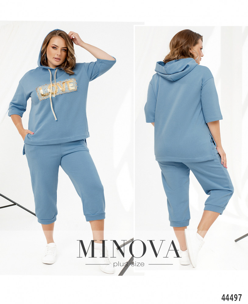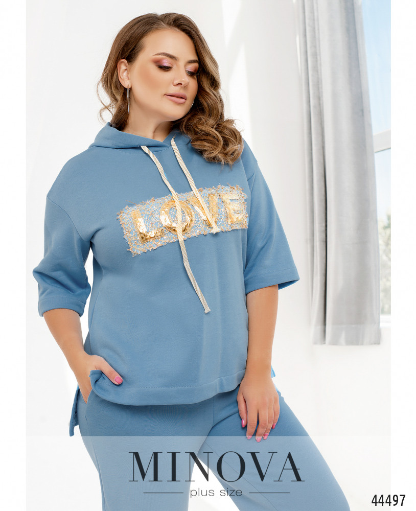 Яркий и удобный костюм большого размера. Толстовка без карманов и застёжек, есть капюшон, через него пропущен шнурок. На груди - декор из пайеток. По бокам подола - разрезы. Рукава без манжет, линия плеча немного приспущена. Брюки с высокой талией, с манжетами, в пояс вшита резинка, по бокам - карманы в шве, застёжек нет.