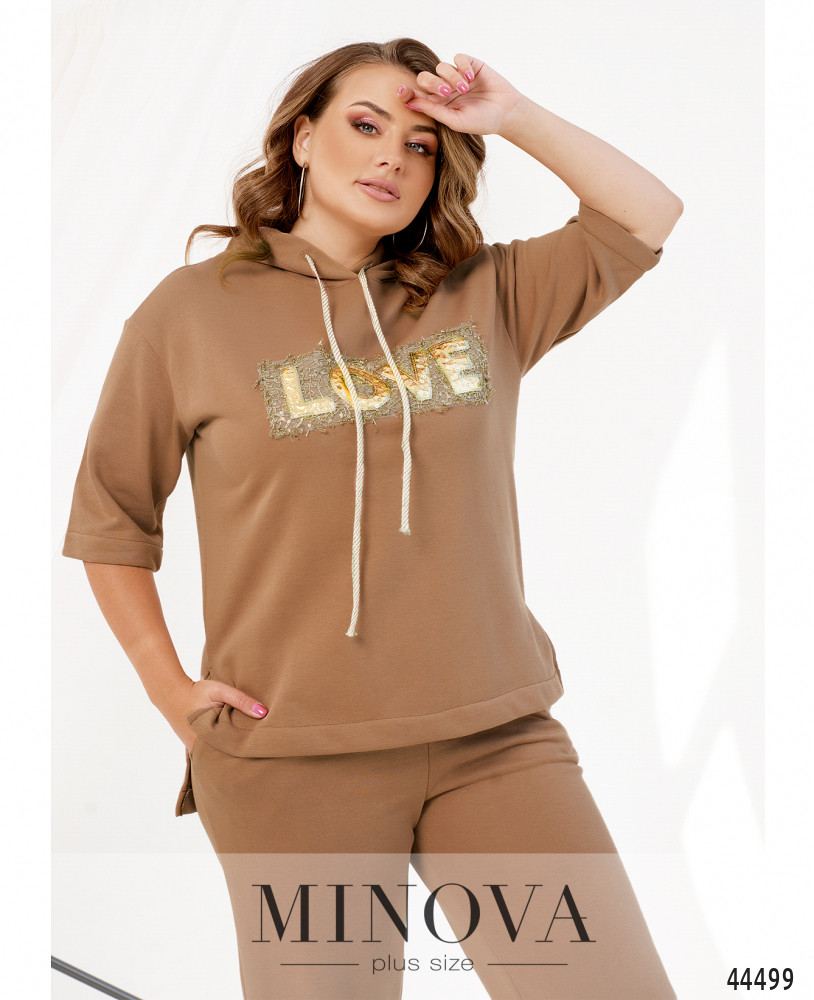 Яркий и удобный костюм большого размера. Толстовка без карманов и застёжек, есть капюшон, через него пропущен шнурок. На груди - декор из пайеток. По бокам подола - разрезы. Рукава без манжет, линия плеча немного приспущена. Брюки с высокой талией, с манжетами, в пояс вшита резинка, по бокам - карманы в шве, застёжек нет.
