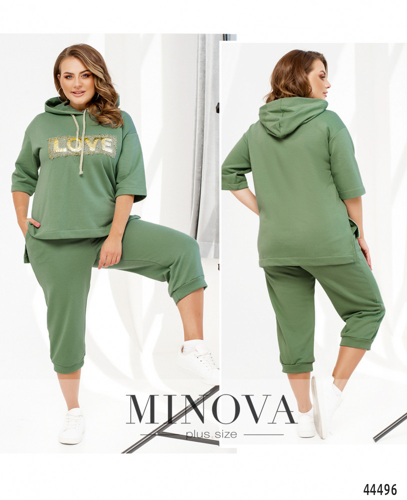 Яркий и удобный костюм большого размера. Толстовка без карманов и застёжек, есть капюшон, через него пропущен шнурок. На груди - декор из пайеток. По бокам подола - разрезы. Рукава без манжет, линия плеча немного приспущена. Брюки с высокой талией, с манжетами, в пояс вшита резинка, по бокам - карманы в шве, застёжек нет.