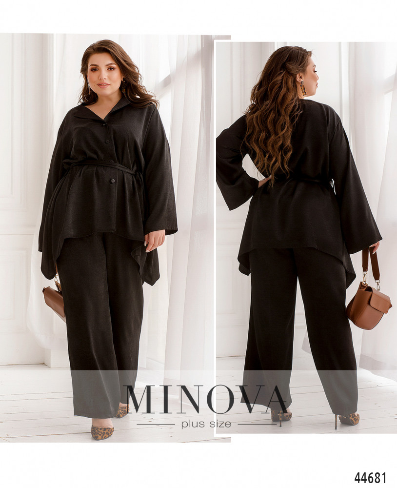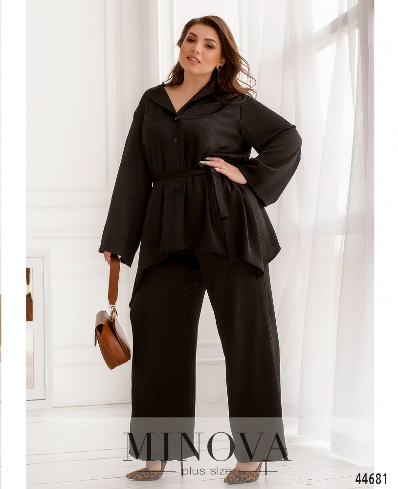 Оригинальный и привлекательный костюм большого размера. Рубашка с шлейками для пояса на талии, воротничок мягкий отложной, рукава без манжет, подол асимметричный, по бокам длиннее. Застёгивается на ряд пуговиц спереди на планке. Брюки с высокой талией, в пояс вшита резинка, по бокам - карманы в шве, застёжек нет. Пояс/аксессуар входит в комплект.