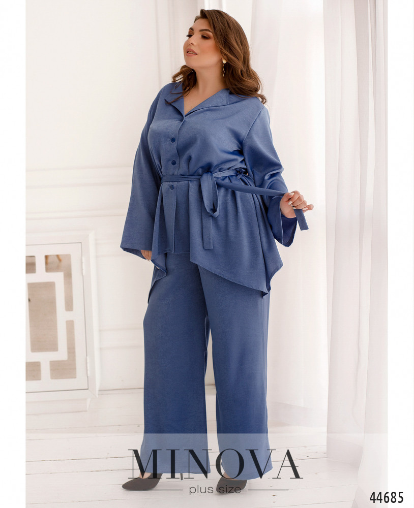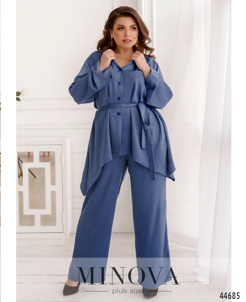 Оригинальный и привлекательный костюм большого размера. Рубашка с шлейками для пояса на талии, воротничок мягкий отложной, рукава без манжет, подол асимметричный, по бокам длиннее. Застёгивается на ряд пуговиц спереди на планке. Брюки с высокой талией, в пояс вшита резинка, по бокам - карманы в шве, застёжек нет. Пояс/аксессуар входит в комплект.